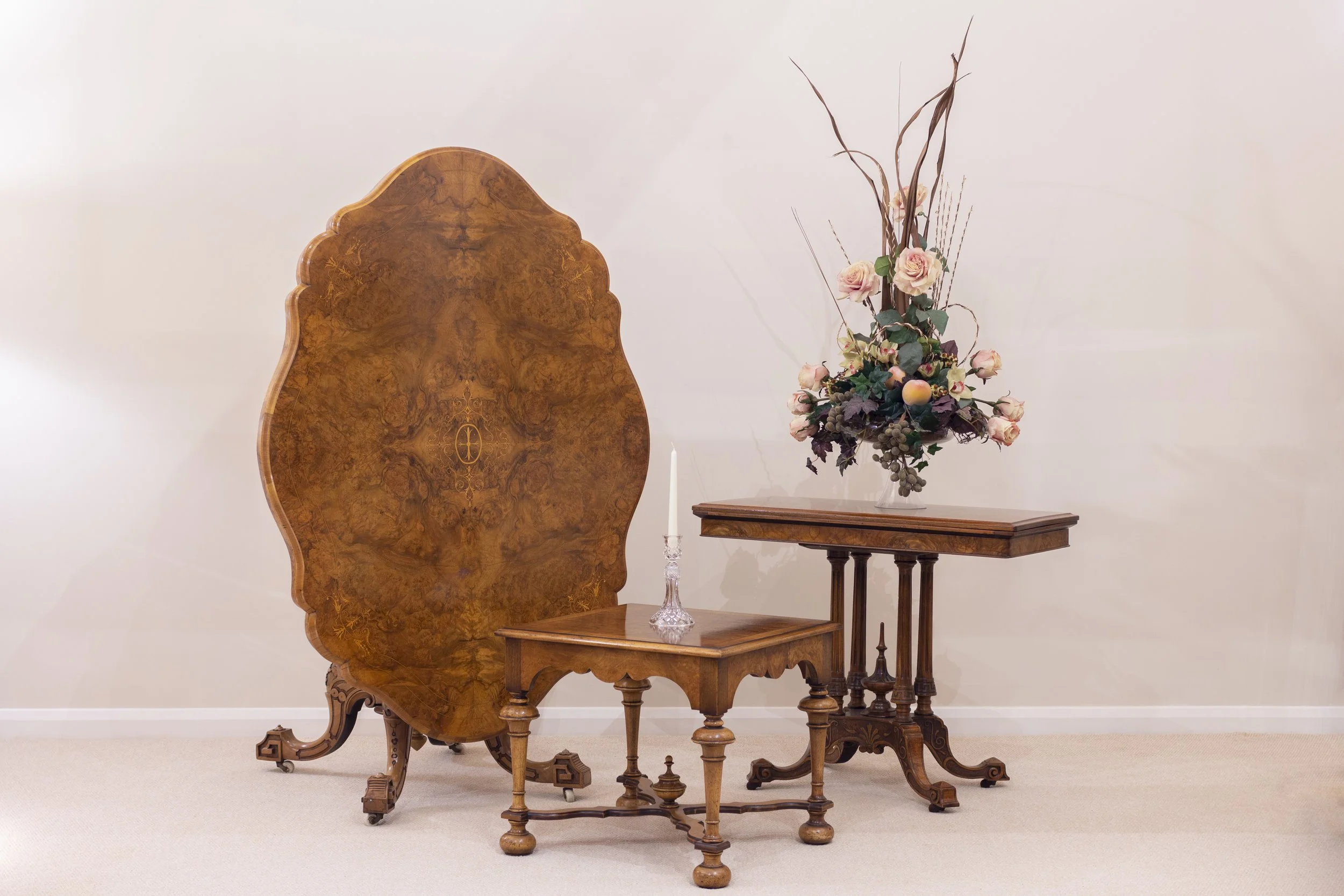 Burr walnut table trio. Past and present perfection!